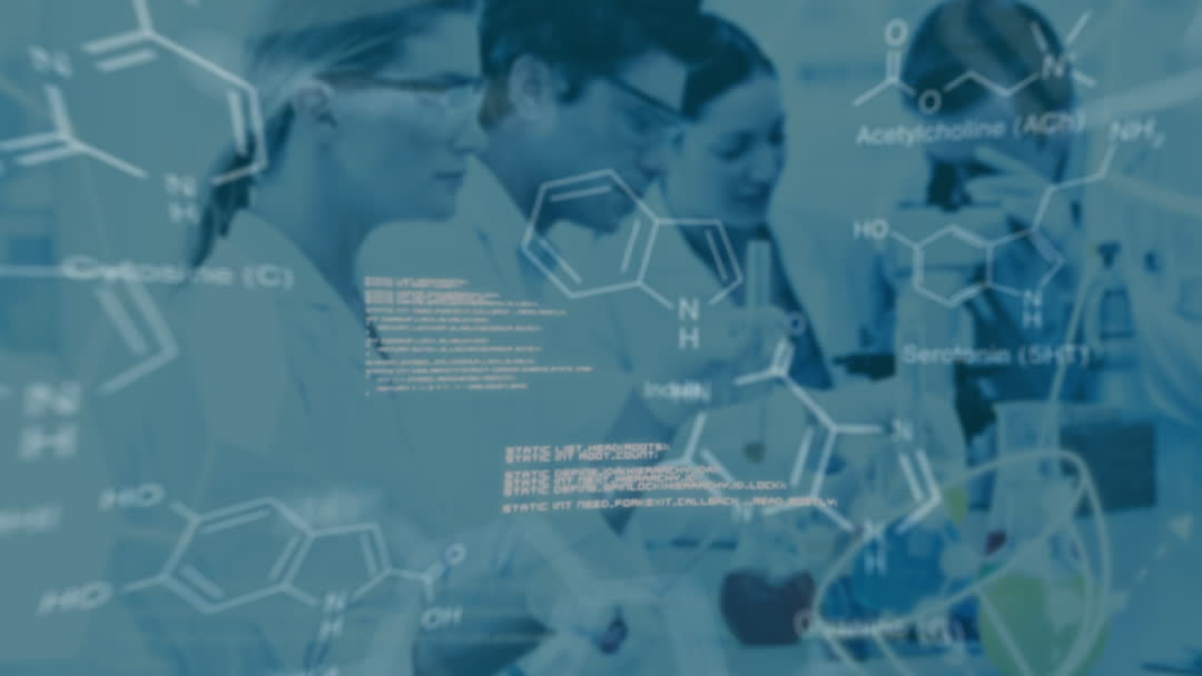 Background showcases diverse scientists engaged in collaborative biotechnology research. Board displays chemical formulas and data processing, highlighting modern technological integration in scientific discovery. Ideal for themes surrounding scientific innovation, collaborative research environments, biotechnological advances, data analysis, and laboratory collaboration.