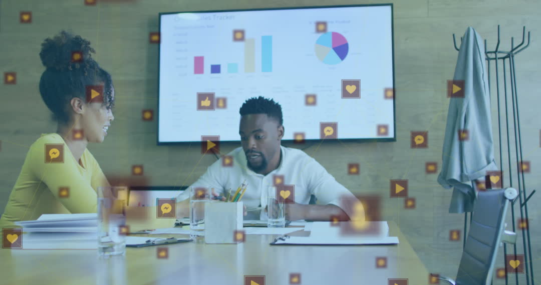 This scene depicts two businesspeople engaged in a meeting with animated network icons overlay symbolizing digital connectivity. Ideal for illustrating modern business communication, technological integration in the workspace, and data-driven decision making. Perfect for use in presentations, articles on digital communication, networking in business operations, or advertisements for office technology solutions.
