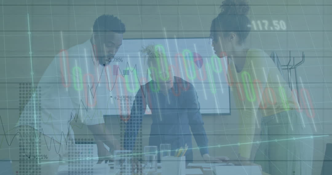Three diverse colleagues engaging in a business discussion with an animated overlay of stock data charts. Useful for illustrating concepts of teamwork, collaboration, and financial analysis in a modern office setting. Ideal for websites or presentations related to business strategy, economic trends, or technology-enhanced work environments.