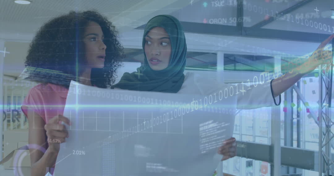 Depicts diverse young professionals collaborating in a modern office with digital graphics overlay, symbolizing advanced data processing and technology integration. Useful for marketing materials on innovation, teamwork, tech development, or business strategies.