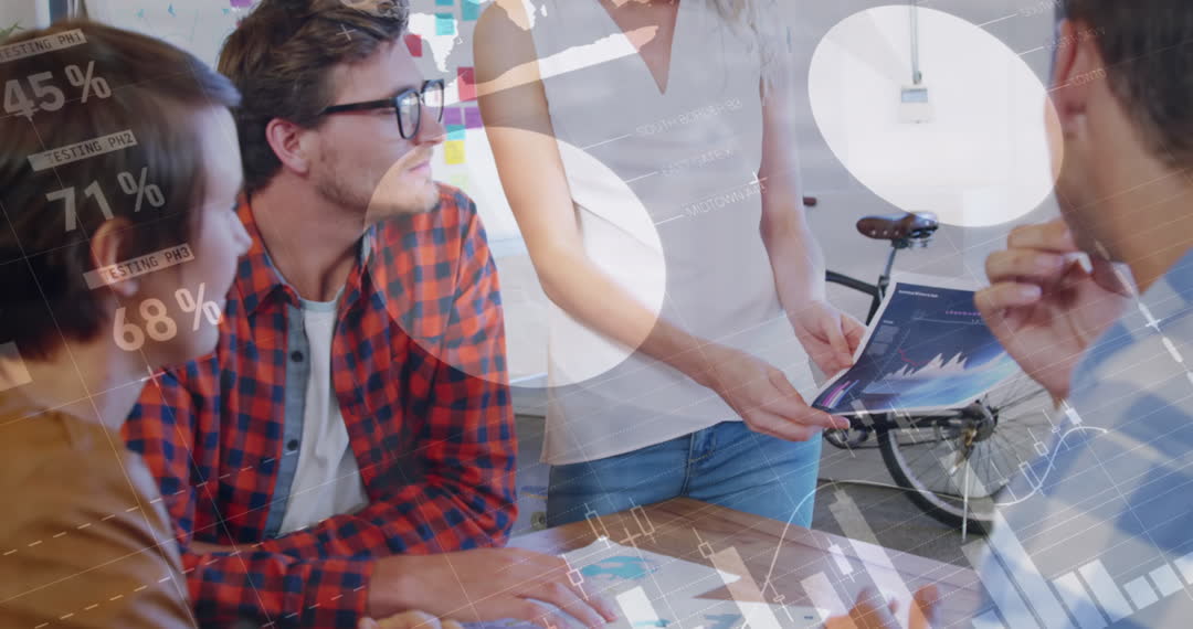 Group of diverse business professionals engaged in collaborative discussion with digital data interface overlaid. Ideal for depicting teamwork and modern collaborative strategies in business environments. Useful for presentations, marketing materials, or articles on technology-driven business solutions.