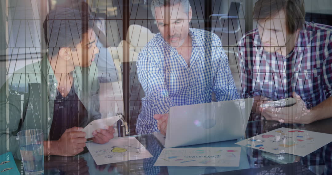 Collaborative Business Meeting with Modern Technology Overlay Video