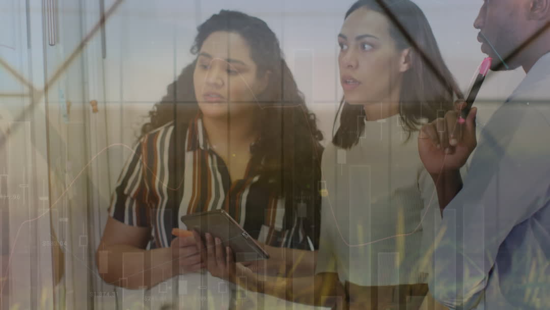 Collaborative Business Strategy Meeting with Financial Data Overlay Video
