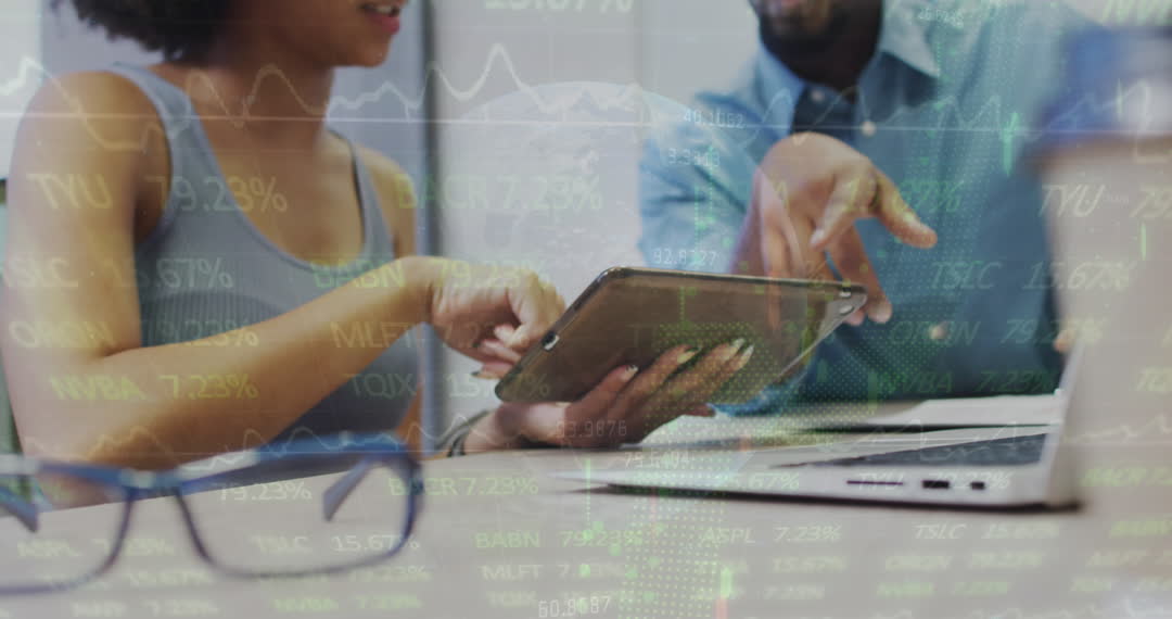 Colleagues discussing financial reports with technology overlay including trading board and graphs, symbolizing modern business strategy and collaboration. This visual can be used for promoting teamwork, financial discussions, tech integration in work settings, or global business strategies.
