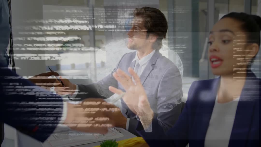 Individuals collaborate in a modern office environment, integrating digital technology. Group exchanges ideas while abstract digital overlays suggest data analysis and innovation. Useful for illustrating team dynamics, business meetings, and tech-driven professional environments.