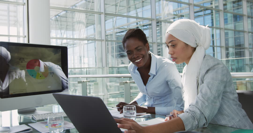 Two businesswomen engaging with digital technology, one wearing a hijab, depict diversity and teamwork. Modern office environment with natural light and professionalism portrayed. Suitable for themes of business communication, multicultural workplaces, and remote collaboration.