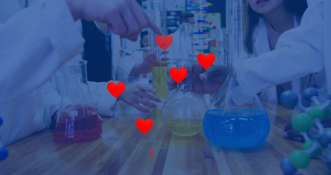 Detailed scene displaying participants engaging in collaborative chemistry experiments. Glass beakers with liquids of various colors suggest diverse chemistry activities occurring. Bright red hearts convey excitement and positive interactions within scientific study environment. Ideal for use in educational content, science programs, teamwork and collaboration features.