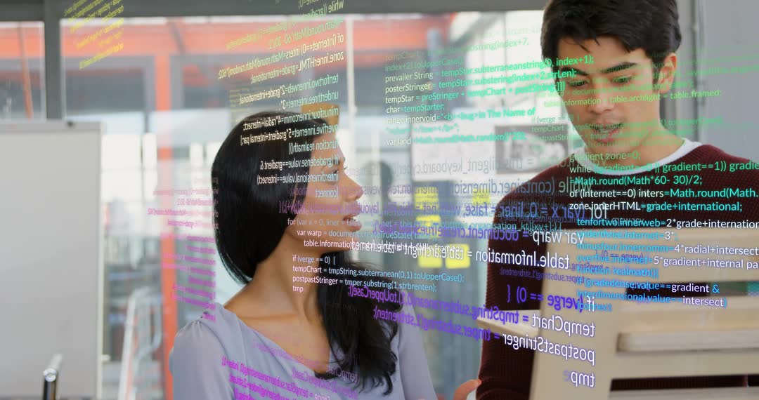 This depicts two colleagues engaged in a code review in a contemporary tech office. The presence of code overlay signifies an interactive technology environment. Useful in illustrating modern office collaboration, advanced software development processes, and teamwork dynamics in IT settings.