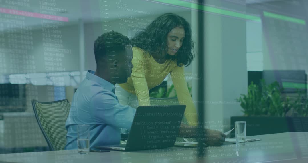 This visual shows two coworkers engaged in collaborative work, highlighted by coding graphics imposed on the scene like a dynamic animation. The colleagues, one sitting and the other leaning over a laptop, demonstrate teamwork and interactive problem solving in a tech-driven environment. Plants and office accessories suggest an organized, professional space. This visual is useful for illustrating articles on software development, technology collaboration, teamwork strategies, modern workplace practices, articles about tech teams in action.