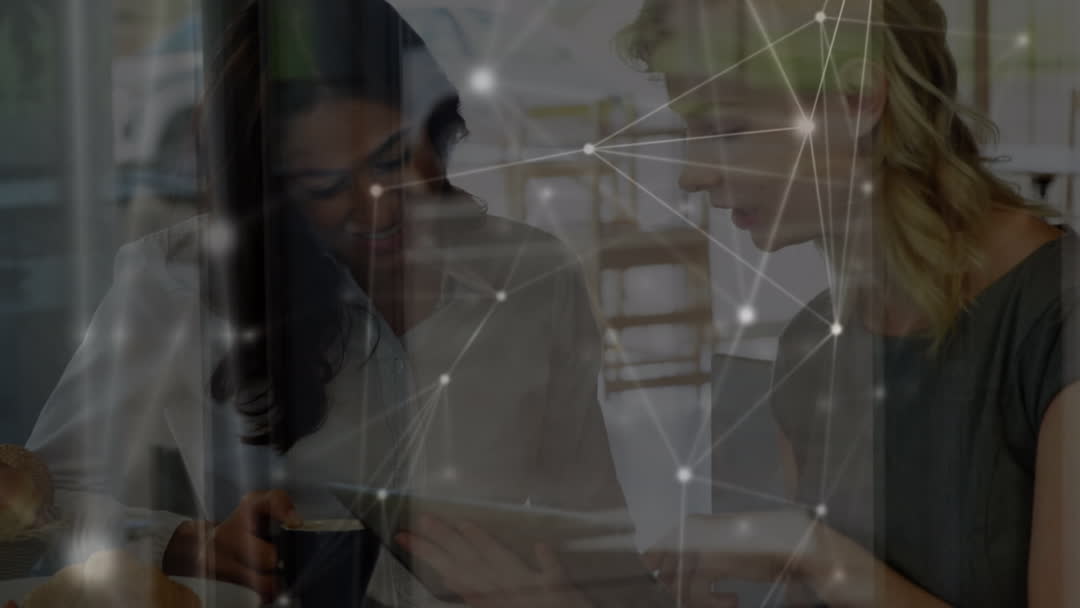 Visual portrays two female scientists in a collaborative moment with an overlaid digital network, indicating themes of technological advancement and innovation. Suitable for projects emphasizing teamwork in scientific research, diversity in STEM fields, technological progress, and data collaboration. Ideal for use in educational material or promotional content for scientific communities or tech conferences.