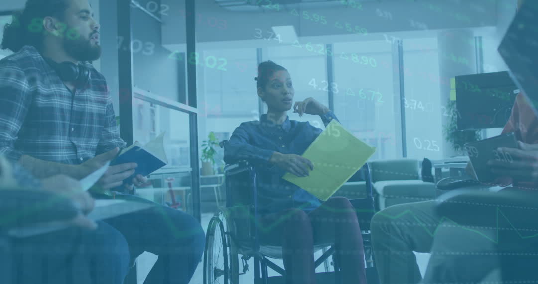 Diverse group of colleagues engaged in a productive discussion about financial growth strategies in a modern office environment. The layered animation of financial data highlights the focus on finances and analytics as part of their brainstorming session. Ideal for use in business presentations, articles about workplace diversity and inclusion, and promotional materials aiming to showcase progressive office setups that embrace collaborative technological solutions.