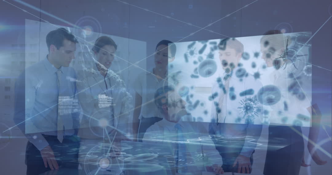 Blend of professional teamwork discussion with futuristic digital overlay includes a multiracial group of coworkers engaging in a collaborative conversation with a male manager in an office setting. Radiation branches out from dynamic, digital videory of blood cells, representing sophisticated technological integration and advanced communication. This can illustrate concepts such as forward-thinking business solutions, innovation in technology and healthcare, and collaborative brainstorming in corporate settings—ideal for presentations, articles underlining sector innovation, or futuristic workplace demonstrations.