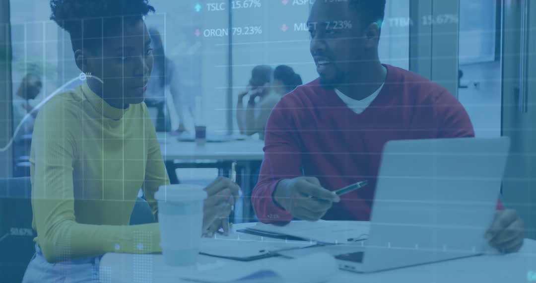 The video shows a modern workspace where two diverse people are sitting at a desk with a laptop, discussing financial data that's digitally overlaid. Ideal for illustrating concepts related to teamwork, modern business strategies, or collaborative financial planning in promotional or informational content about business services, technology solutions, and financial analytics.