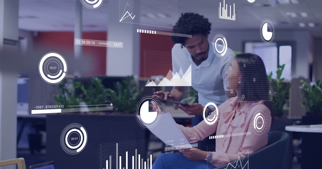 Two professionals are engaged in a collaborative workspace discussion surrounded by digital data visualizations and analytics interfaces. This visual highlights modern business practices where diverse teams leverage technology in data processing and decision-making. Ideal for illustrating concepts of teamwork, technological integration in businesses, and modern financial analysis operations. This can be used in articles discussing data-driven business strategies, consultations on digital transformations in offices, or advertisements for analytic software solutions.