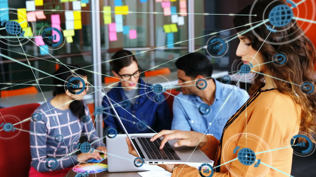 People working in an office sharing ideas incorporate modern digital technology in developing global business strategies. Imagery of visible networking icons highlights connectivity and innovation, providing ideal visuals for presentations about digital transformation, business networking concepts, and the impact of modern technology on workflow.