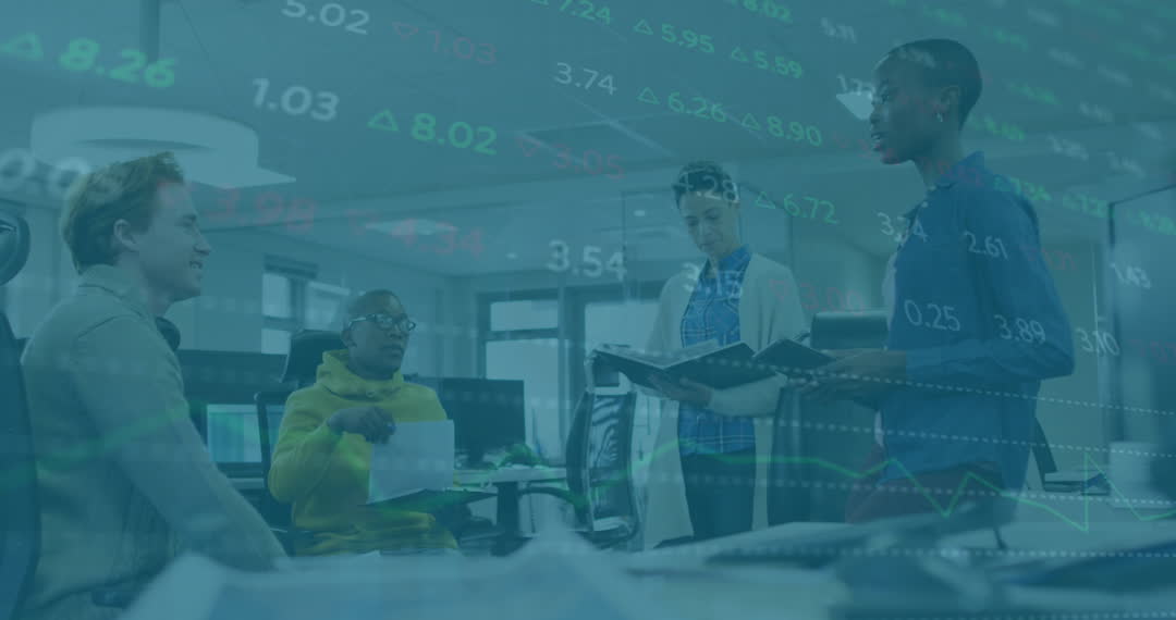A diverse group of coworkers engaging in a team discussion in a modern office. Overlaid with digital financial data, demonstrating the dynamic intersection of business and technology. Ideal for illustrating business reports, teamwork articles, financial planning guides, strategic development contexts, and modern workspace designs.