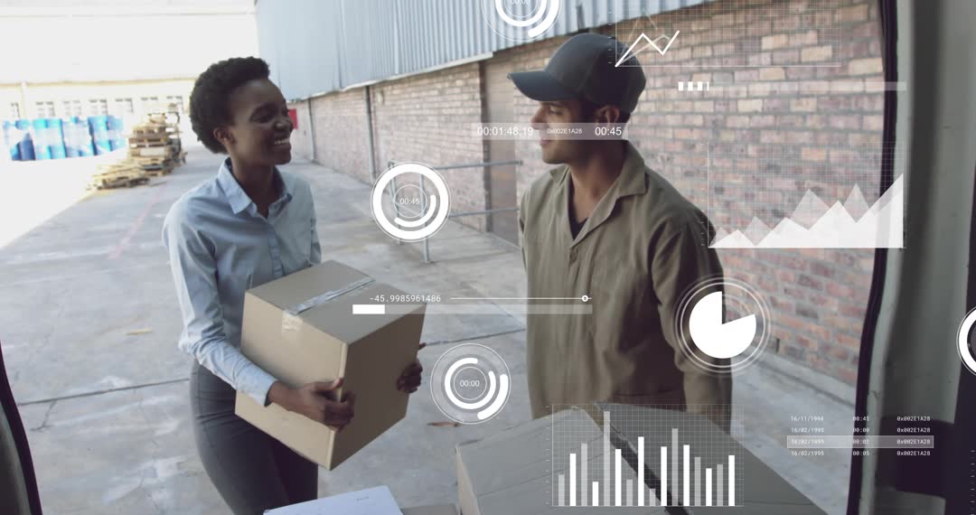 Workers actively engaging in warehouse logistics process, exchanging packages while futuristic data graphics represent efficiencies and tools in place. Useful for presentations or articles about modernizing supply chain operations, implementing smart logistics, or enhancing team collaboration in shipping services.