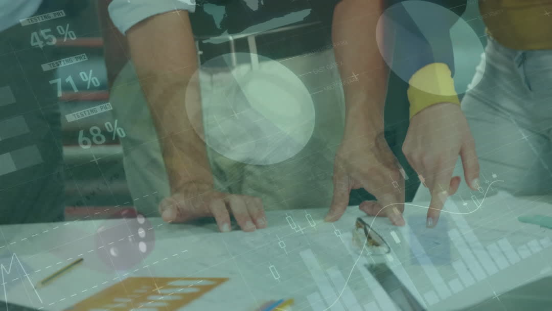 Business professionals are working together, analyzing reports with digital data visuals overlayed. Ideal for illustrating concepts of teamwork, financial reporting, data visualization in modern business contexts.