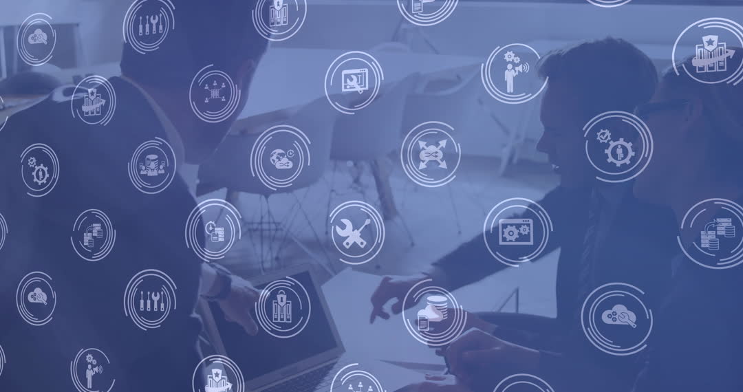 - Collaborative Team Analyzing Technology Icons Overlay in Office
