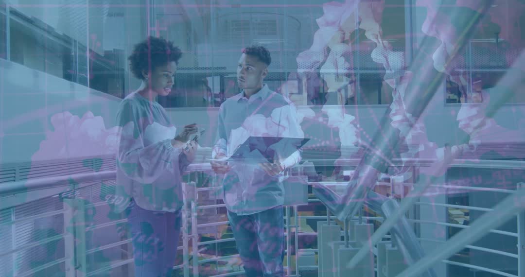 Two professionals engage in a dynamic conversation with digital financial charts superimposed, suggesting discussion of data or strategy. Ideal for content about modern business practices, technological innovation, digital communication, and teamwork in corporate environments.