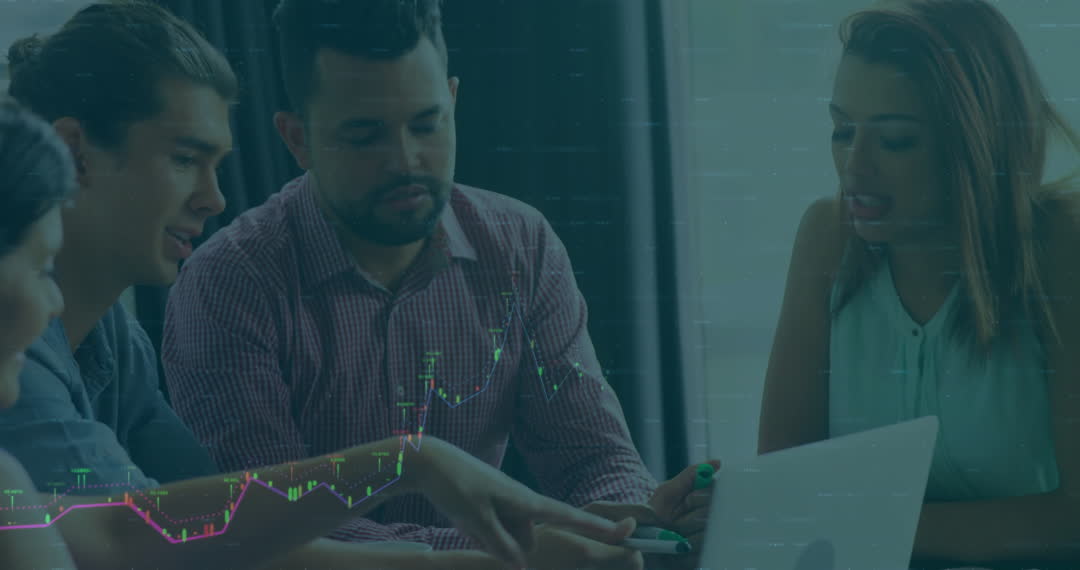 - Collaborative Team Discussing Work with Financial Digital Overlay