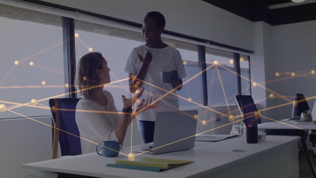 Two colleagues engage in a animated discussion in a contemporary office setting, with network and data processing graphics overlaying the scene. Ideal for visual content on teamwork, technological advancement in workplaces, and collaboration. Can be used for presentations, promotional materials, and articles focusing on corporate culture and modern office environments.