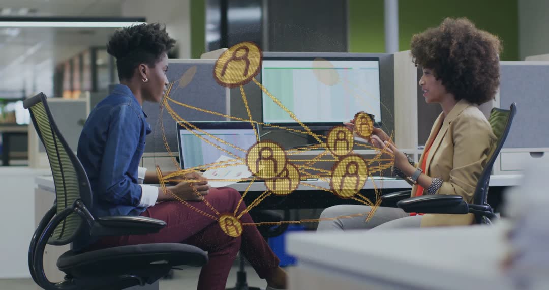 Professional environment where two coworkers collaborate in an innovative digital setting using technology to enhance connection and communication. Ideal for use in articles or content about modern workplace practices, effective team collaborations, technological innovations in offices, and the impact of digital tools on communication and professional interaction.