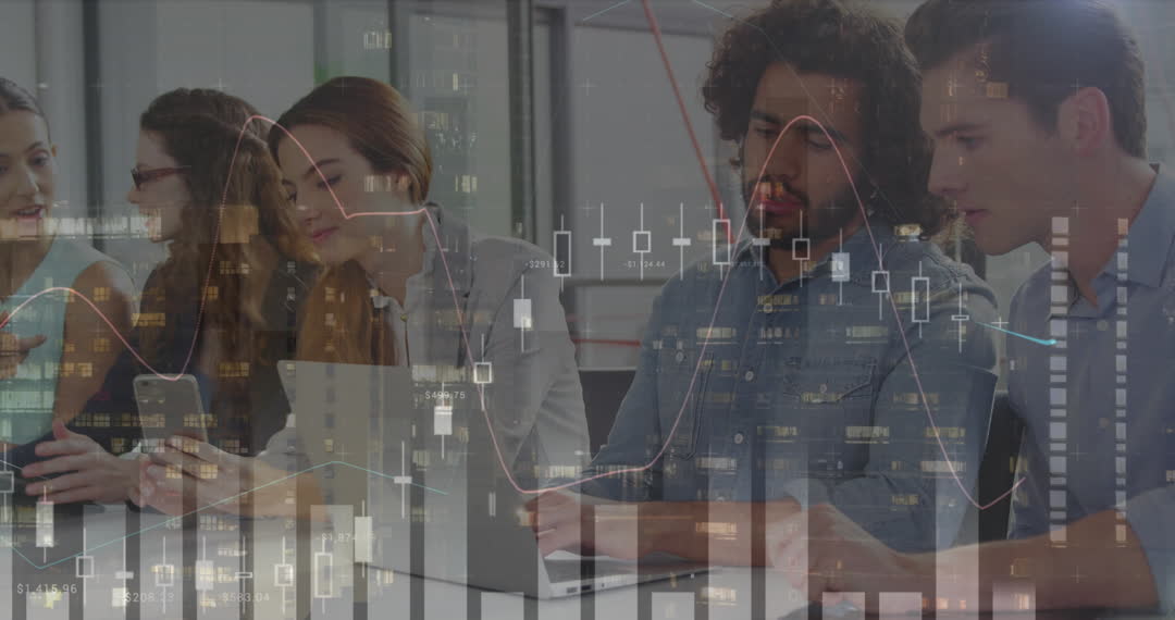 Four diverse colleagues engage in a collaborative business meeting, utilizing technology and data visualization. The overlay of statistical graphs and financial charts signifies a focus on data analysis and technology-driven solutions. This picture is ideal for use in articles or promotions focusing on modern business environments, teamwork, and the efficiency of data-driven strategies. It portrays a technology-infused setting that highlights teamwork and analytical discussions.