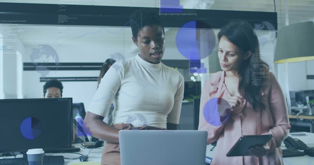 Two professional women engaged in collaborative discussion surrounded by digital data processing animations in a modern office environment. One woman is working on a laptop while the other uses a tablet, demonstrating teamwork and innovation. This visuals symbolize technological advancement and data-driven strategies, ideal for content about business technology solutions, startup teams, collaborative projects, or office productivity applications.