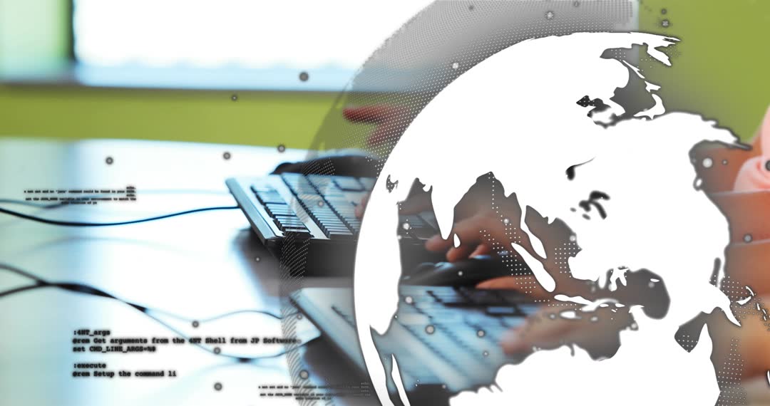 This video depicts two individuals typing and collaborating at computers with digital elements including a globe overlaid to suggest connectivity and data transfer. Suitable for illustrating modern teamwork, innovative digital communication, and global business operations, ideal for tech, communication, network alliances and office environments videos.