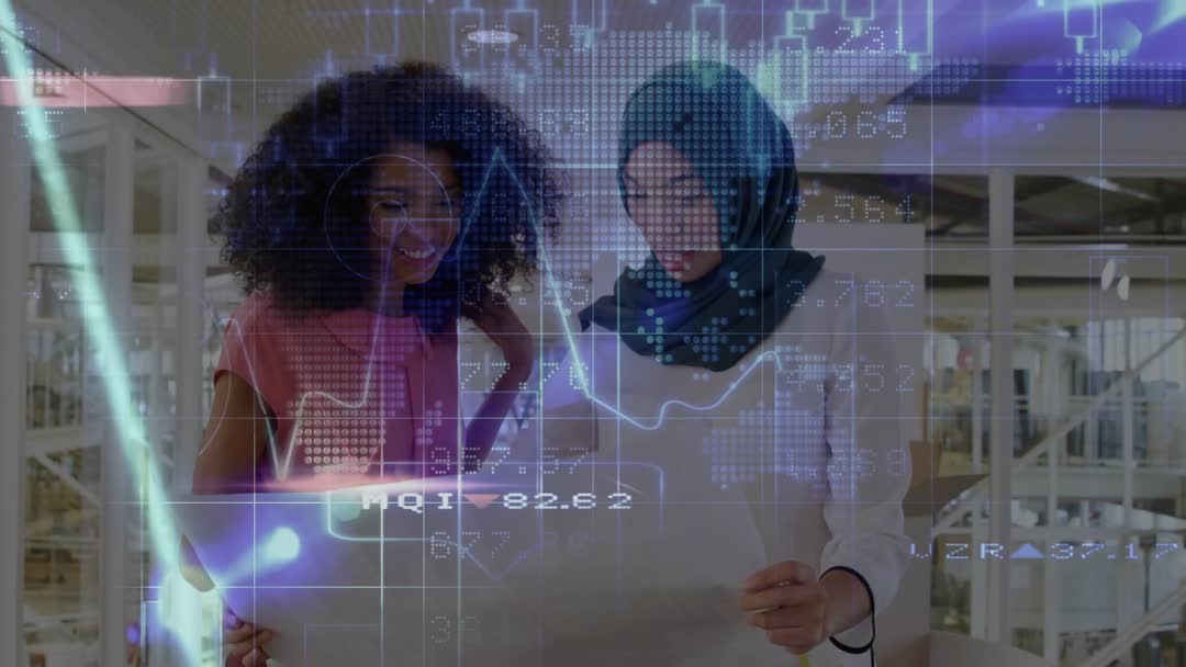 This video frame shows two professional women collaborating over a blueprint, integrated with digital data charts. Their expressions of engagement reflect teamwork and innovation. Ideal for use in contexts related to business collaboration, digital transformation in architecture and design, and professional environments highlighting diversity and technology.