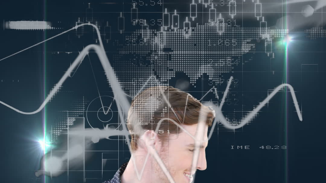 Depicts a businessman overlaid with digital graphics representing financial data processes and market trends. Suitable for illustrating business solutions, economic articles, market analytics, investments, and finance technology.