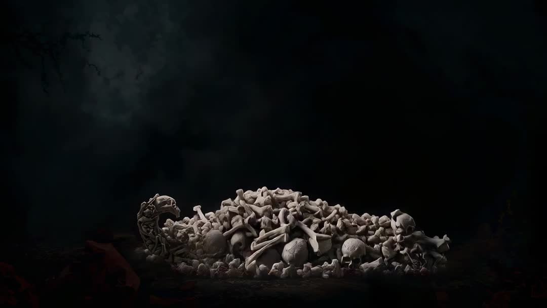 AI Generated Image. Skeletal structure in a crypt setting forms letter J, gradually collapsing into arch pile of bones and skulls, highlighted by sweeping beam of light. Eerie and gothic atmosphere evokes themes of decay and desolation, suitable for use in horror-themed projects, design inspiration for film and game production, or thematic art showcases focused on macabre and shadowy aesthetics.