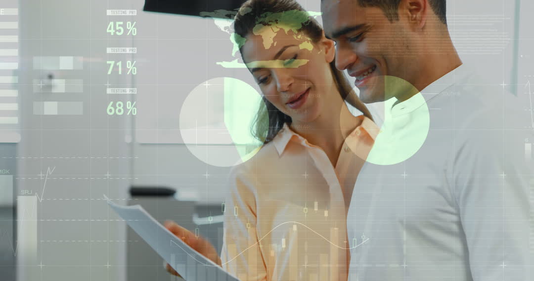 A diverse man and woman engaged in analyzing statistical data and discussing reports in a modern office. Digital overlays of data graphs represent financial and business analytics, emphasizing collaboration with technology in business settings. Suitable for use in presentations on teamwork, tech-driven decision-making, or office productivity.