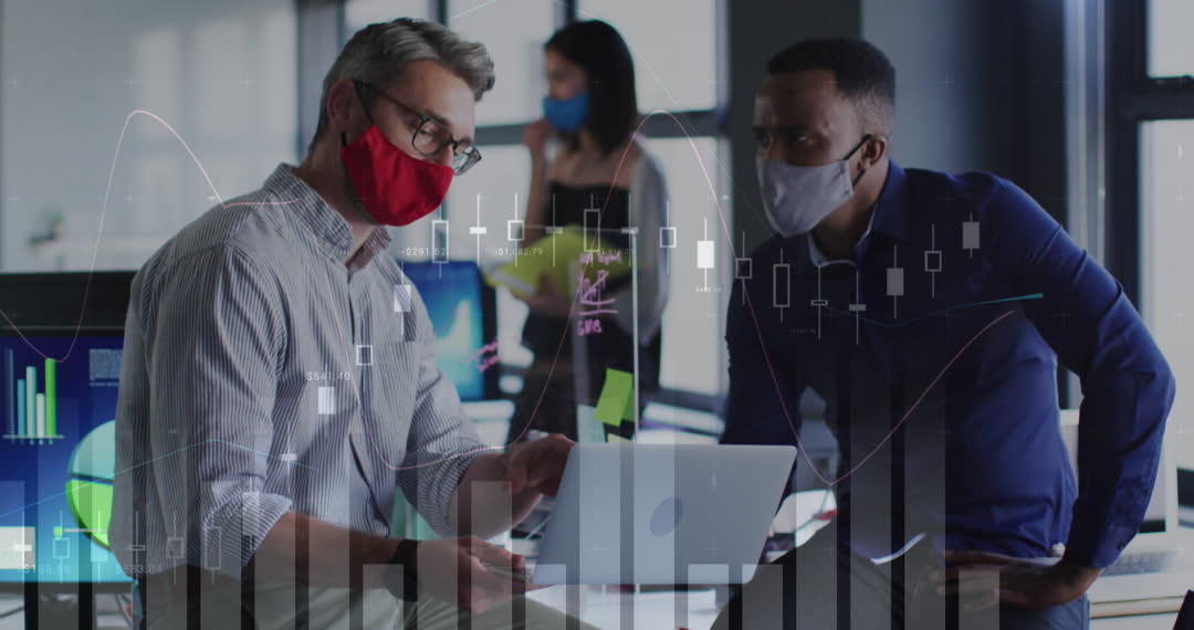 Two male colleagues, wearing face masks for safety, are collaborating at a workstation with laptops. An overlay of financial charts adds a technological edge, reflecting data analysis in a professional setting. This stock photo is useful for depicting modern business practices during health safety protocols or in contexts of digital analytics, team collaboration, and diverse work environments.