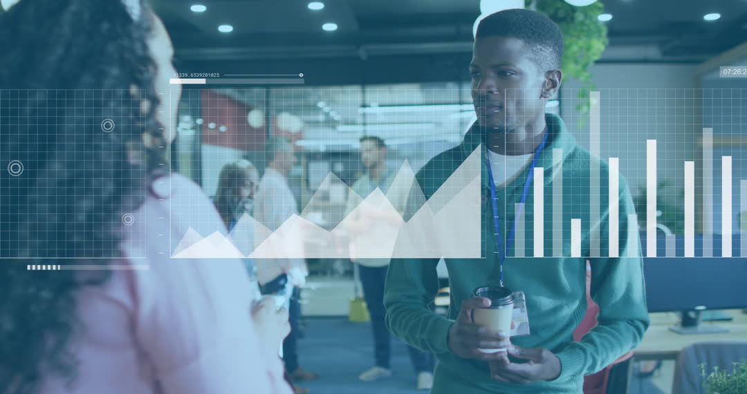 Two people are discussing in an office environment while a digital overlay of statistical graphs and data is projected around them. This video is suitable for illustrating themes around modern business analytics, collaboration in the workplace, and data-driven decision making. It can be used in articles or presentations about technology in business or collaborative work environments.