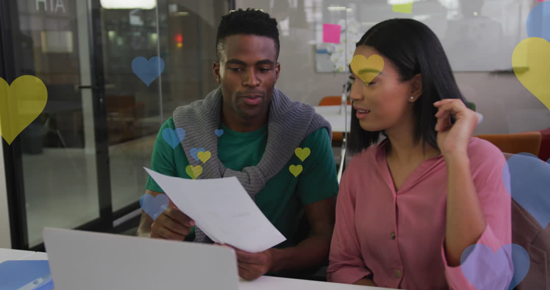 - Colleagues Analyzing Data with Heart Icons Overlay