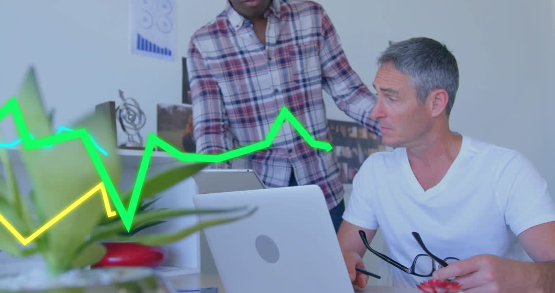 Business professionals examining animated line graphs for data analysis indicating focus on innovative digital solutions. The video can be used for illustrating modern business environments, teamwork, and effective collaboration in a tech-savvy setting, suitable for presentations on data analytics and corporate strategy.