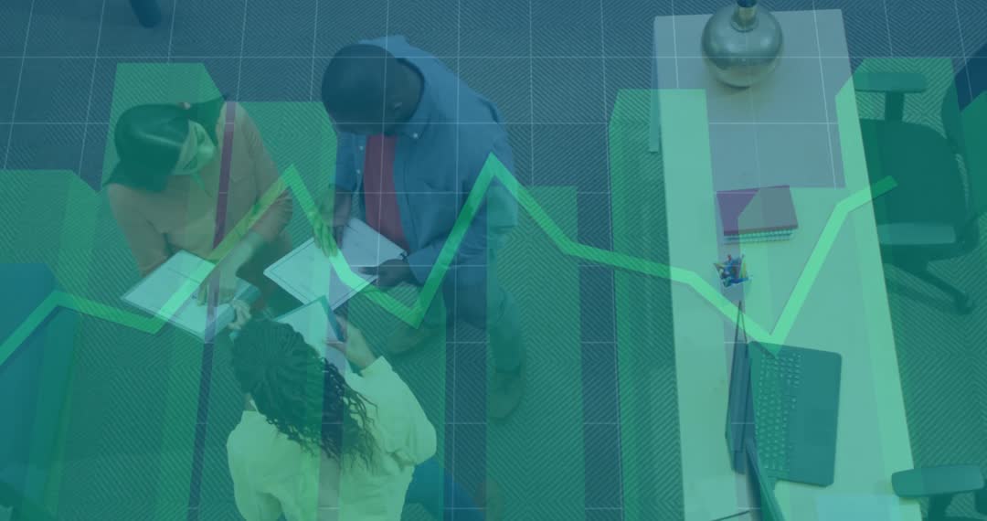 The video depicts a group of colleagues standing around a desk, possibly analyzing business data as a green graph signifies positive growth. The scene is set in a professional office environment, emphasizing teamwork and strategic discussions. This video is ideal for use in articles or presentations focusing on business growth, collaboration in the workplace, or teamwork dynamics.