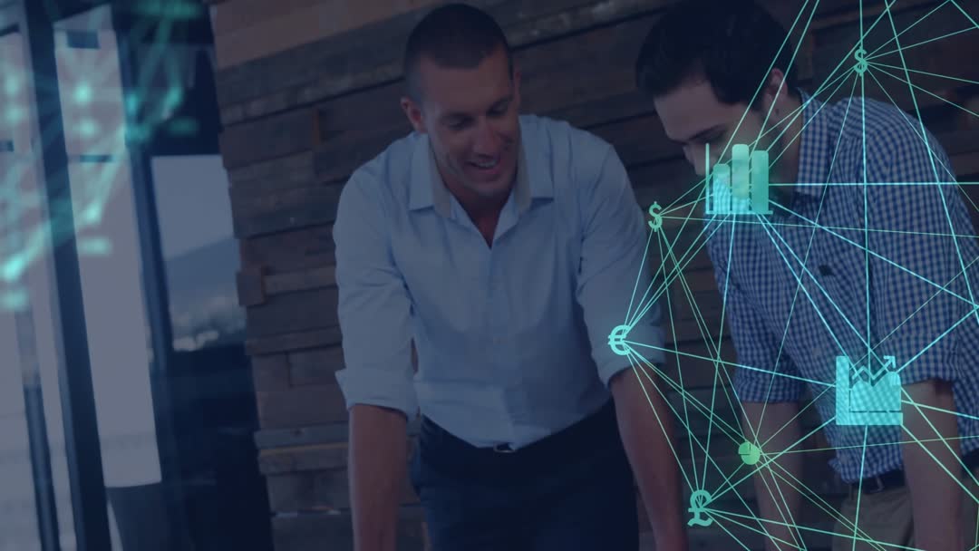 Two colleagues engaged in discussion at office desk, examining digital network of finance-related icons. Highlights collaboration and the use of technology in financial processes, illustrating modern collaborative setups where data and technology play a central role. Ideal for articles or blogs about digital transformation in finance, teamwork, modern office environments, or innovative business strategies.
