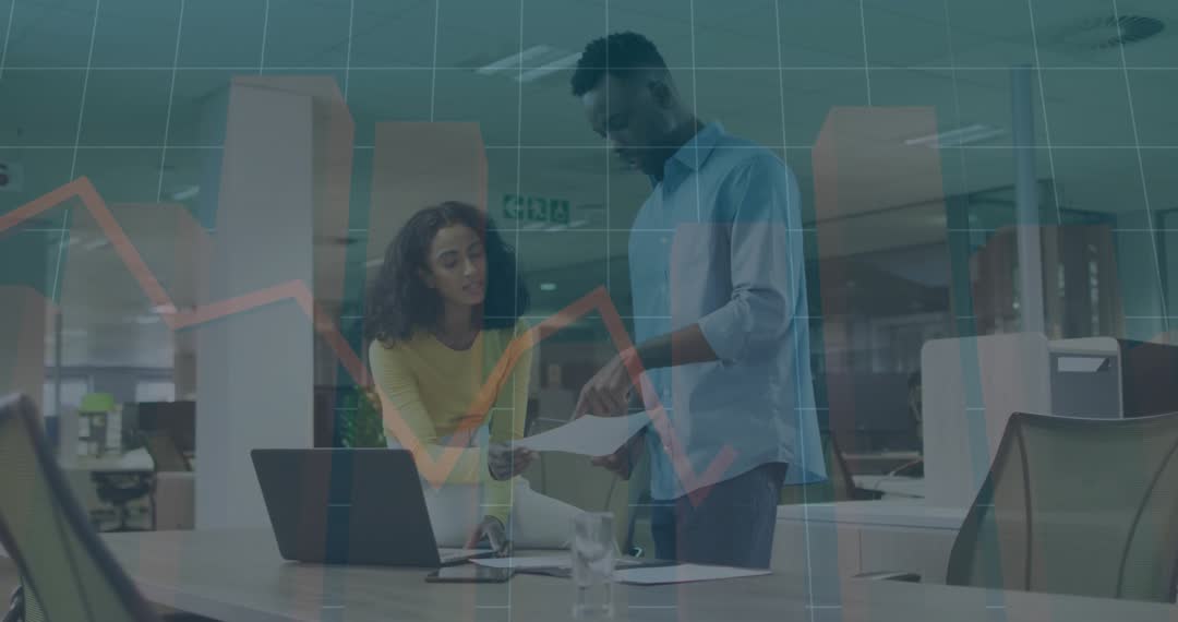 Two professionals are engaged in discussion over a report beside a desktop, with a digital financial chart superimposed over the scene. The chart displays rising bars and a line graph indicating positive growth trends. This video can be used in articles about business collaboration, data analysis, technology integration in workplace, or showcasing teamwork.