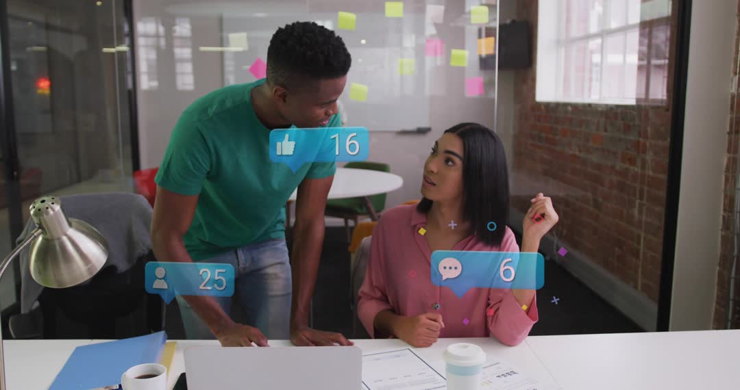 Colleagues collaborate in office examining marketing charts with integrated social media metrics. Interactive graphics float overwork area suggesting digital engagement analysis. Useful for illustrating teamwork, social strategy development, and modern business communication.