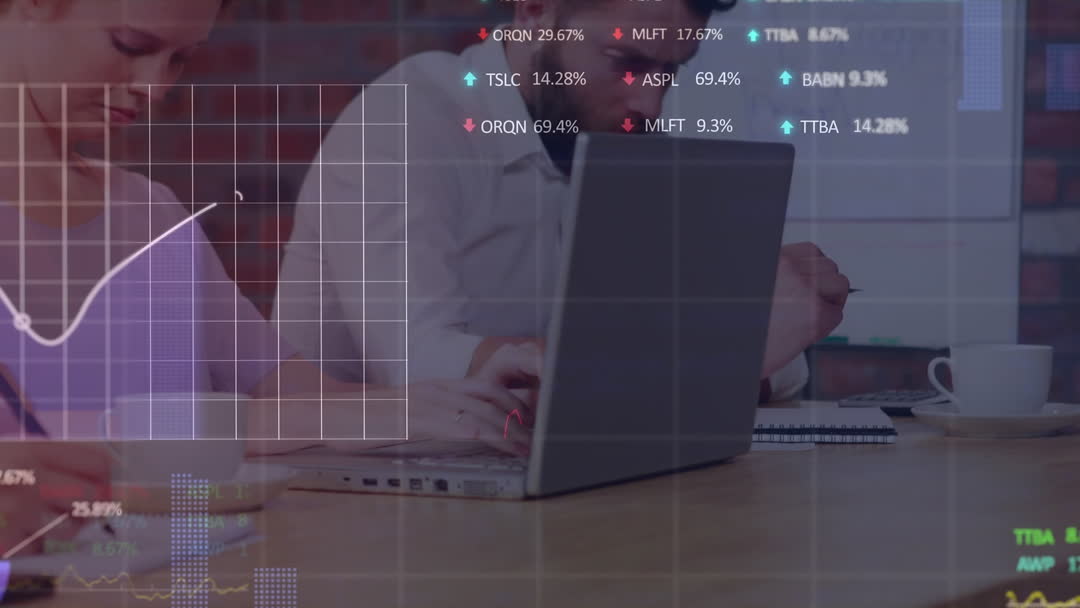 Individuals collaboratively working on laptops showing stock market data overlaying festive technology graphs on screen are well-suited to bookkeeping, financial reports, economic trend presentations, business meetings, company collaborations, and digital consultations.