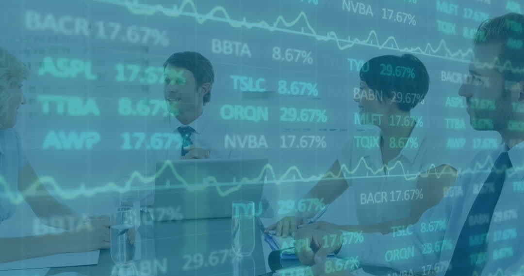 - Colleagues Brainstorming with Stock Market Data Overlay