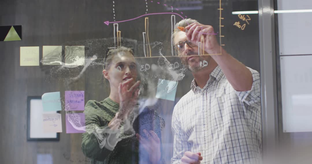 A woman is lifting a blue sticky note while a man draws a bar chart on a transparent board, showcasing teamwork and business strategy development. This video is perfect for illustrating modern corporate environments, innovation, and data-driven decision-making. Ideal for use in presentations, blogs, websites, or any material focused on business operations and collaboration.
