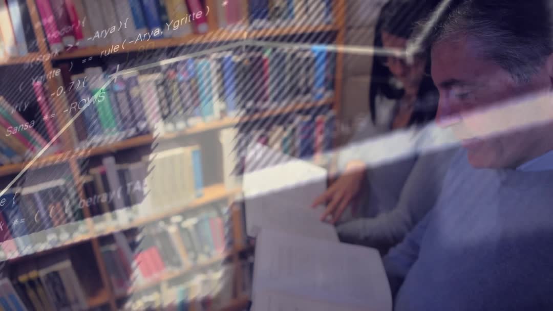 In this intriguing blend of visuals, two colleagues are seen collaborating and reviewing research papers surrounded by an extensive collection of books. Meanwhile, an overlay of code snippets and data graphs symbolizes the blend of technology and academic research. This versatile content is perfect for illustrating modern study techniques, the importance of data in research, and teamwork in academic settings.