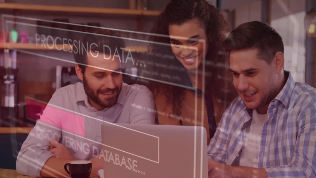 Colleagues are gathered around a laptop, actively working on data analysis. Projected animations display phrases like 'processing data' and 'querying database', suggesting a focus on technology, coding, or IT-related tasks. This may be used for themes relating to collaborative team efforts, database management, and innovative digital solutions.