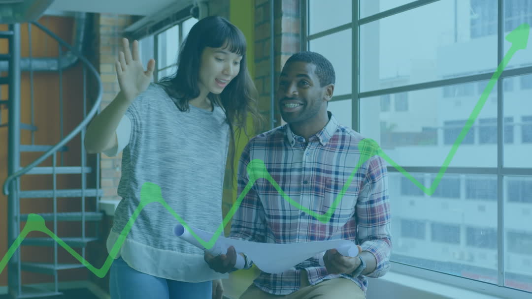 A woman and man are collaborating in a modern office environment, looking at financial documents blended with overlaying animated graphs. These elements convey an atmosphere of strategic planning, teamwork, and data-driven decision making. Suitable for illustrating concepts in business presentation materials, articles on corporate collaboration or diversity in the workplace, and financial analysis case studies.