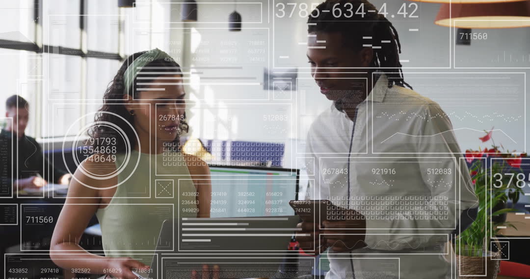 Two diverse colleagues engaging in a discussion, complemented by a digital overlay suggesting data processing and technology elements. This visual can be used in contexts related to teamwork in tech-driven environments, digital business solutions, or modern office culture. Suitable for businesses emphasizing diversity, inclusivity, or innovative technology interactions.