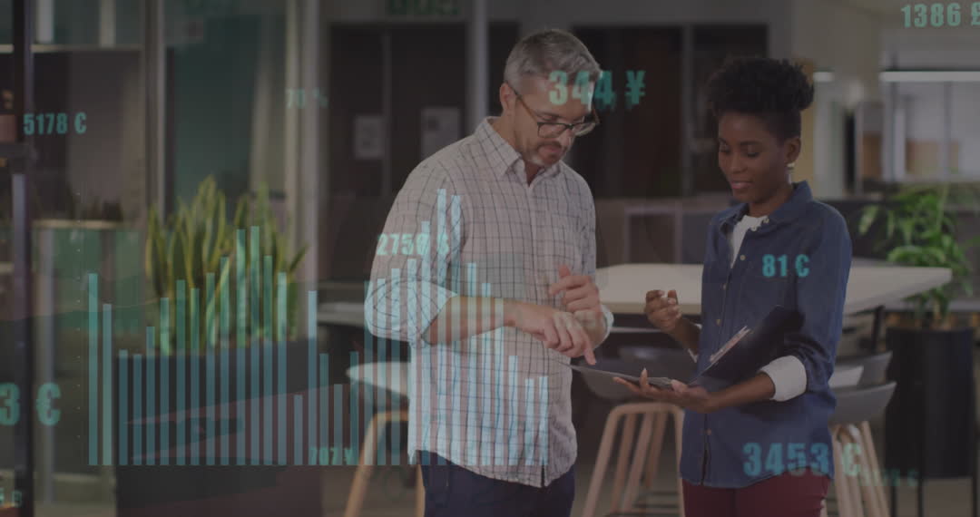 This scene shows diverse colleagues engaging in a business meeting at an office setting, overlayed with animated financial data suggesting a focus on analytics and technology. Ideal for illustrating teamwork in business contexts, discussions related to financial analysis, or showcasing the integration of digital interfaces in modern workplaces.